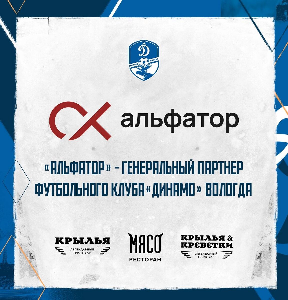 ⚡️Группа компаний «Альфатор» генеральный партнёр ФК «Динамо» Вологда В состав компании «Альфатор» входят известные вологодские рестораны «Мясо», «Крылья» и «Крылья&Креветки», а также банкетный зал Sky Hall. Сотрудничество с таким крупным и успешным предприятием будет способствовать развитию нашего клуба и достижению новых высот. Мы уверены, что это партнёрство принесёт нам много пользы и откроет новые возможности для развития футбола в Вологде. Группа компаний «Альфатор» получит право разместить свой логотип на игровой форме «Динамо» и в рекламных материалах клуба. «Динамо» и «Альфатор» уже планируют совместные мероприятиях с участием футболистов и другие активности на матчах бело-голубых. @dynamovologda