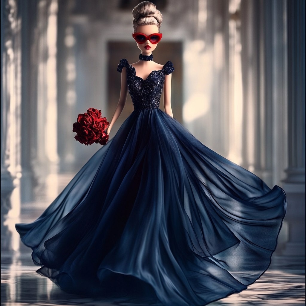 Создано на основе запроса: sophisticated barbie with red spectacles in a dark blue flowing dior dress