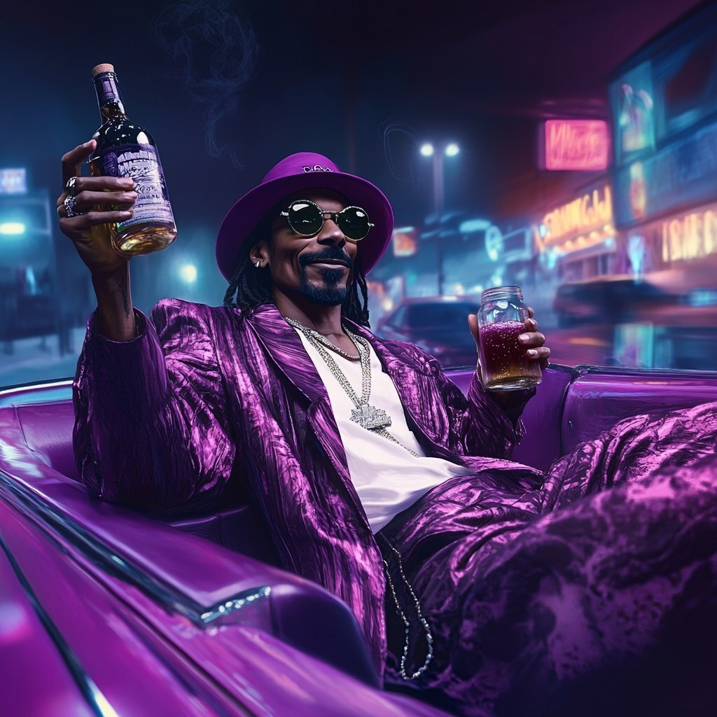 Создано на основе запроса: Snoop Dogg riding in back of purple low rider with ground effects lighting holding bottle of gin in one hand and
