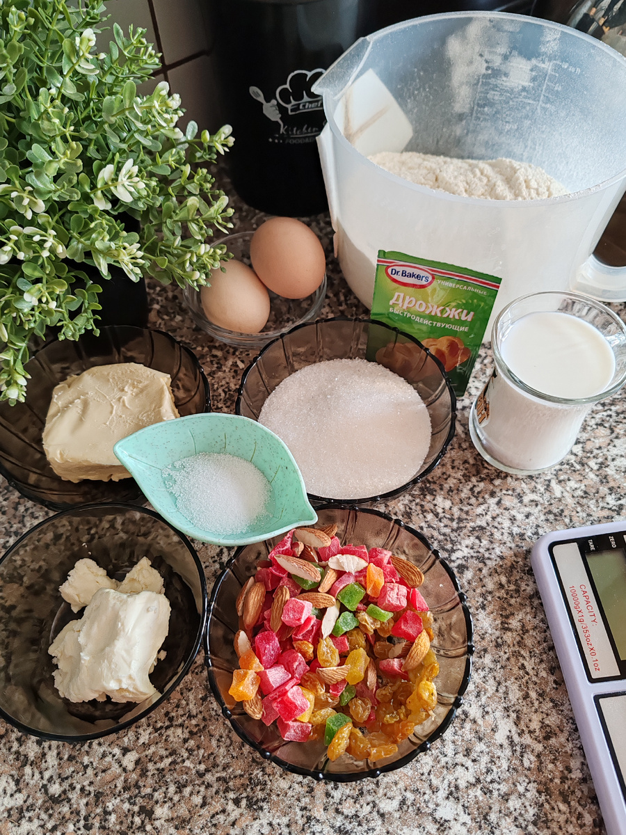 Доброго времени суток, мои дорогие друзья и гости канала. Сегодня я хочу поделиться с вами обалденным рецептом кулича. Нежнейшее сдобное тесто, сухофрукты, цукаты - это просто огонь) Итак, приступим) для приготовления нам понадобится 120 мл тёплого молока 2 яйца 50 гр растопленного сливочного масла 100 гр сахара 1/3 чайной ложки соли 7 гр дрожжей 450 гр муки * 50 гр мягкого сливочного масла *100 гр сухофруктов и орехов Для начала отмечу, что все ингредиенты должны быть комнатной температуры. В чашу разбиваем яйца, кладём сахар и соль. Всё перемешиваем венчиком до полного растворения сахара. Далее вливаем растопленное сливочное масло, перемешиваем. Затем тёплое молоко и дрожжи. Снова все перемешиваем до объединения всех ингредиентов. И в завершении добавляем просеянную муку. Замешиваем тесто. Оно получается мягкое, и немного липнет к рукам. Накрываем чашу пищевой пленкой или потенцем и оставляем на час. Далее присыпаем мукой рабочую поверхность и раскатываем тесто в прямоу
