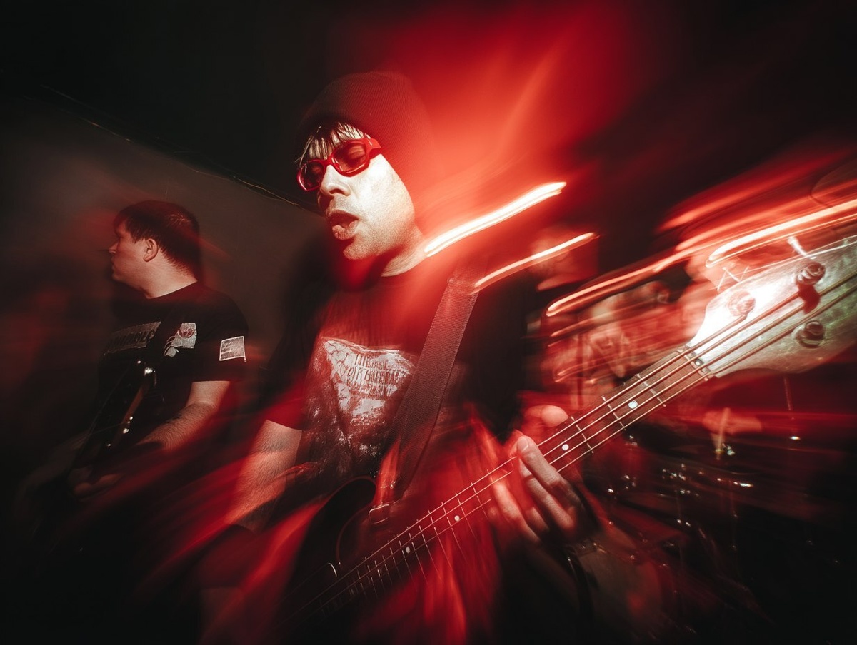 Создано на основе запроса: Grindcore gig at a small venue. The band wears red spectacles. Napalm death. Professional concert photography. Motion blur. Depth of field.