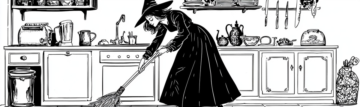 Создано на основе запроса: a witch sweeping the kitchen, block print style, line art, vintage illustration, white background