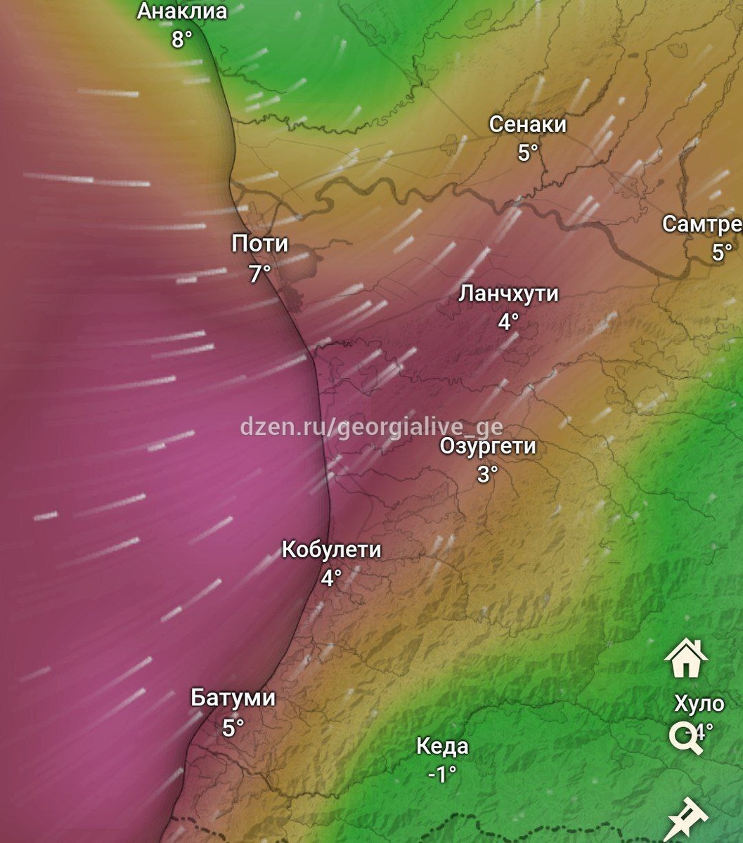 В ближайшие часы на побережье Грузии ожидается штормовой ветер с сильными порывами и дождь. Пик - приблизительно с 1 до 3 ночи, возможны местами порывы ветра до 100 км/ч. На море - возможен шторм с волнами до 2 - 2.5 метров (но не везде) Будьте аккуратны и осторожны, не выходите без необходимости на улицу и держитесь подальше от линии прибоя - море в шторм очень коварно.