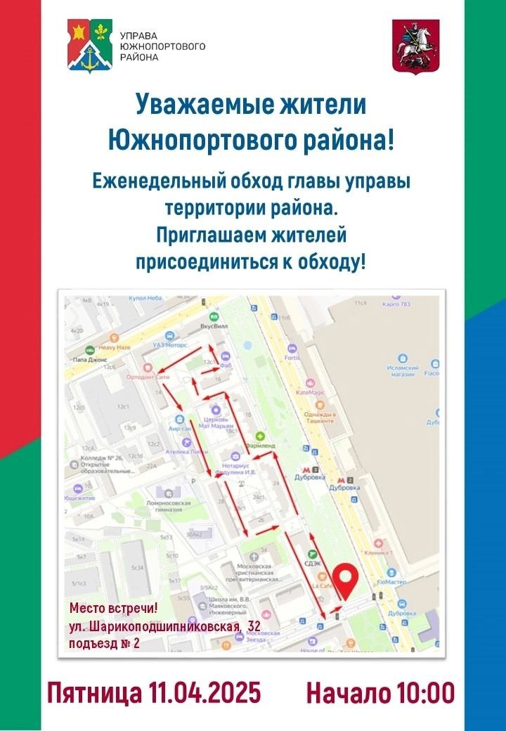 Уважаемые жители Южнопортового района! В пятницу, 11 апреля, глава управы Южнопортового района проведет обход территории. Начало обхода в 10:00. Место встречи: ул. Шарикоподшипниковская, 32 (подъезд № 2) и далее по маршруту. На обходе будут присутствовать: глава управы, первый заместитель главы управы, руководитель и заместители руководителя ГБУ «Жилищник района Южнопортовый», начальник участка и муниципальные депутаты. Вы сможете задать вопросы, обсудить важные темы и поделиться своими предложениями по улучшению жизни в нашем районе. Ждем Вас на встрече!