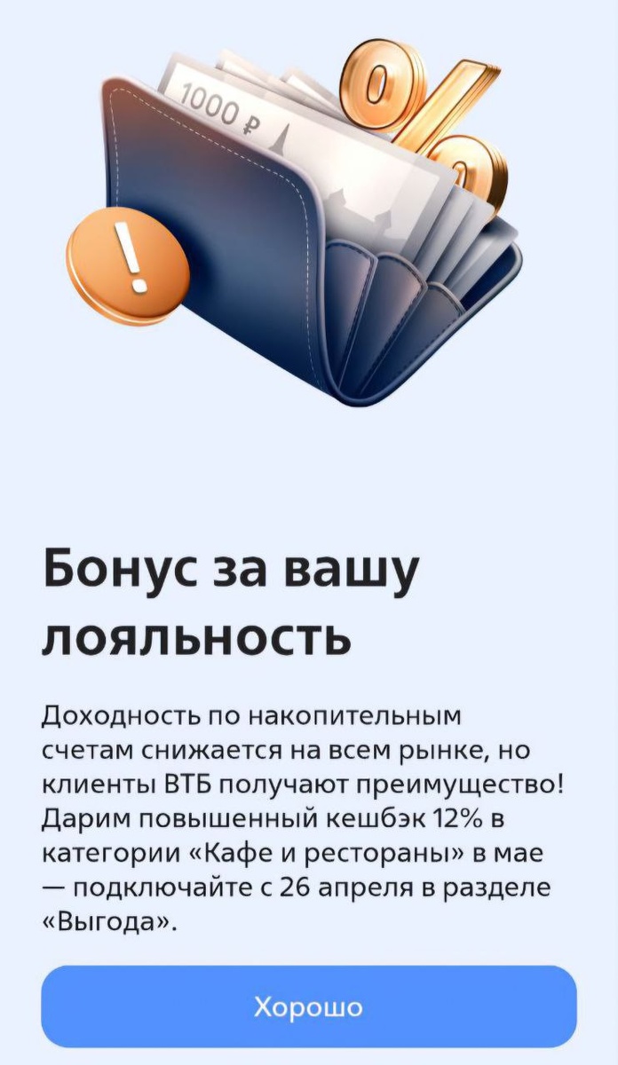 💳 Клиенты ВТБ с активным НС стали замечать баннер с извинительным кэшбэком: 10-12% в "Кафе и ресторанах" С 15.04.25 будет снижены промо-ставки по ВТБ-Счету на минимальный и ежедневный остаток до 19%, в т.ч по действующим. 📱Проверяйте мобильное приложение на наличие баннера.