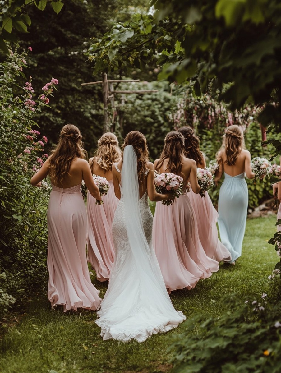Создано на основе запроса: A photo of the bride and her bridesmaids in pink dresses, walking through an outdoor garden with green grass and