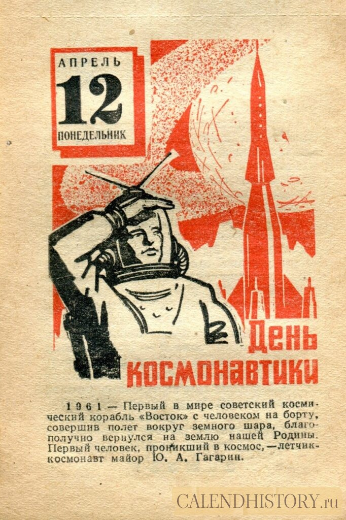 Итак, сегодня 12-го апреля и у нас на календаре 1965-й год. Перед нами листок советского календаря для женщин. На календаре у нас понедельник - 12 апреля 1965-го года. ДЕНЬ КОСМОНАВТИКИ 1961 — Первый в мире советский космический корабль «Восток» с человеком на борту, совершив полет вокруг земного шара, благополучно вернулся на землю нашей Родины. Первый человек, проникший в космос,—летчик-космонавт майор Ю. А. Гагарин. *** Оборотную сторону листка этого календаря можно посмотреть у нас по ссылке на сайте. Заходите на наш интересный сайт об отрывных календарях. Другие листки советских календарей смотрите у нас на сайте - CALENDHISTORY.ru ПОСМОТРИТЕ ЕЩЁ ЛИСТКИ ОТРЫВНЫХ КАЛЕНДАРЕЙ: