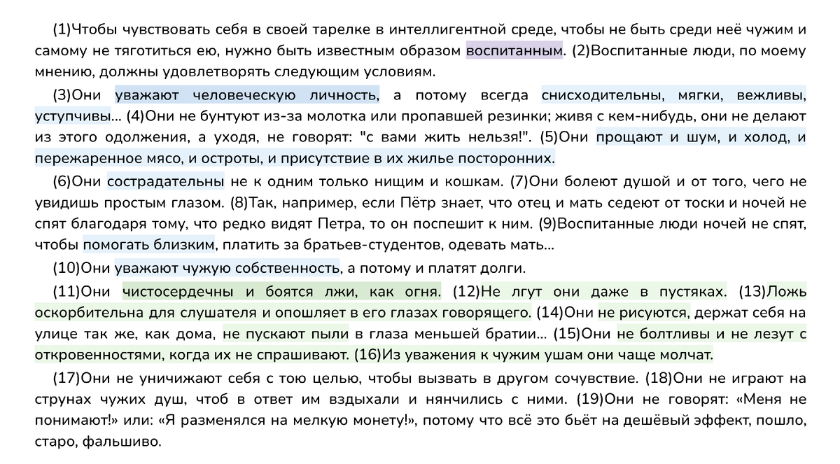 Чтобы подтвердить свои мысли, писатель говорит о том, что вежливые люди уважают других, «а потому всегда снисходительны, мягки, вежливы, уступчивы». Они не разговаривают тогда, «когда их не спрашивают», из уважения к окружающим «они чаще молчат». Воспитанные люди не станут раздувать скандал из-за пустяка и простят «и шум, и холод, и пережаренное мясо». Становится ясно, что воспитанность проявляется в уважительном отношении к другим, в тактичности и понимании.