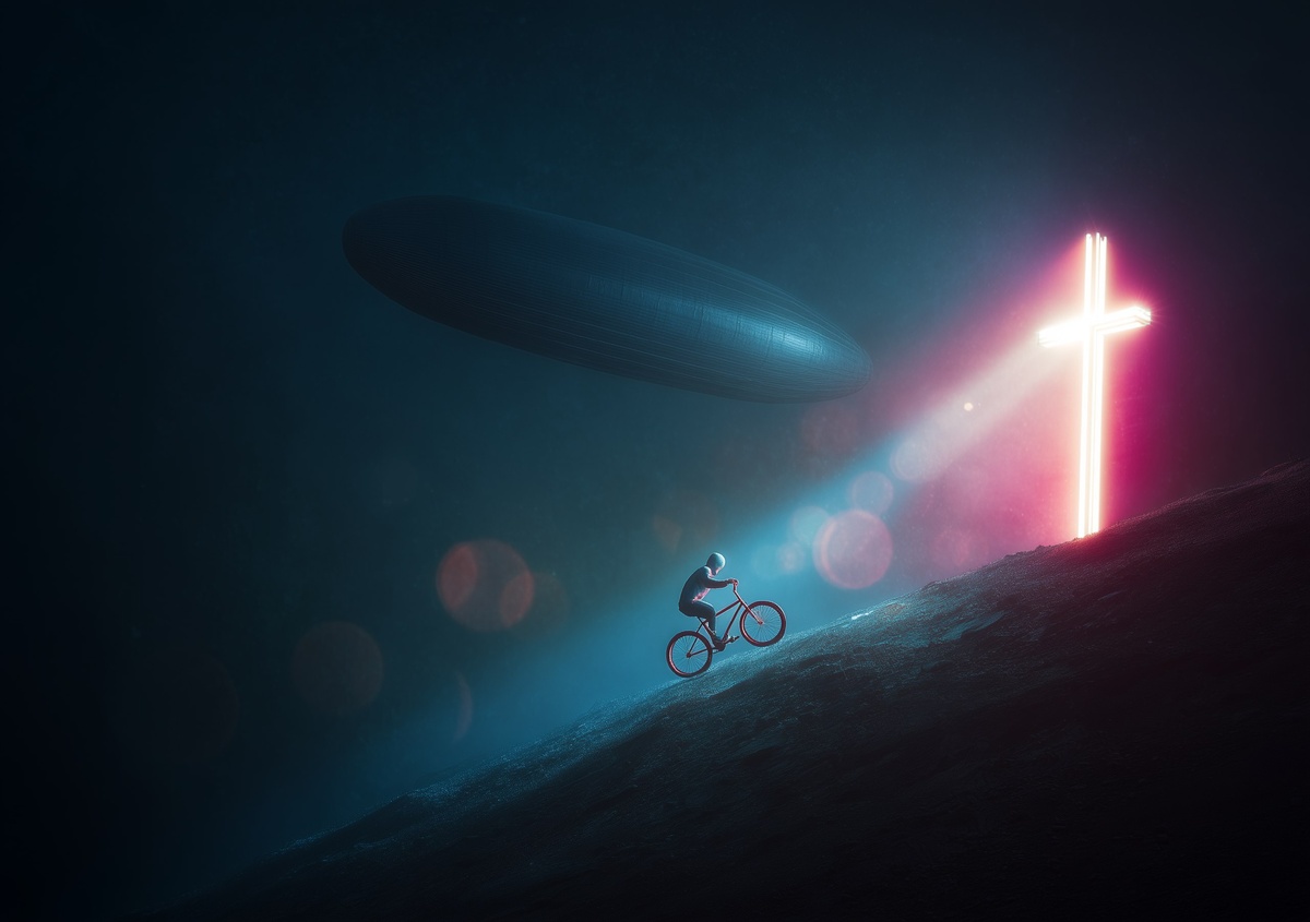 Создано на основе запроса: jesus christ bicycling on his tiny pennyfarth under the dark blimp nibiru ab a steep hill to hang on his neoncore cross, photographed with hassleblad, bokeh, octane render, art by ChrisWaikikiAI