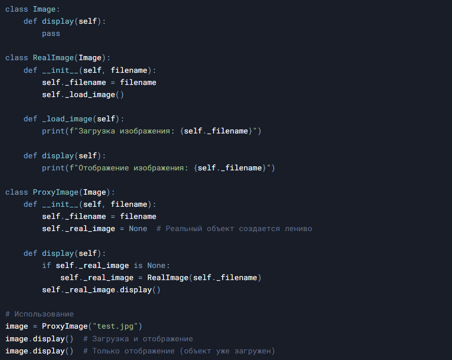 Паттерн «Заместитель» (Proxy) — это структурный шаблон проектирования, который предоставляет объект-заменитель для контроля доступа к другому объекту. Он действует как прослойка, позволяя выполнять дополнительные операции до или после обращения к реальному объекту. В Python этот паттерн особенно полезен для реализации ленивой инициализации, контроля доступа, кэширования и логирования. Зачем использовать паттерн Proxy? Паттерн Proxy решает несколько задач: 1. Ленивая инициализация (Virtual Proxy): Создание ресурсоемких объектов только по требованию. 2. Контроль доступа (Protection Proxy): Проверка прав доступа перед выполнением операций. 3. Кэширование (Cache Proxy): Сохранение результатов запросов для повторного использования. 4. Логирование: Фиксация действий с объектом без изменения его кода. 5. Удаленный доступ (Remote Proxy): Взаимодействие с объектами, находящимися в других адресных пространствах. - Виртуальный прокси: Откладывает создание объекта до момента его использования. -