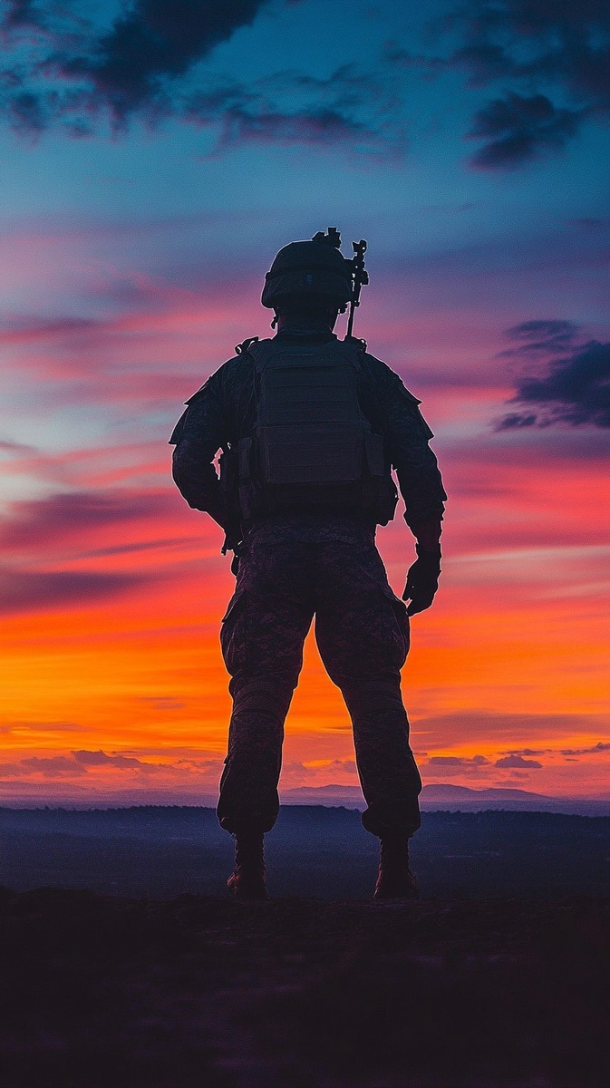 Создано на основе запроса: A silhouette of an American soldier in full gear, standing tall against the backdrop of a vibrant sunset sky