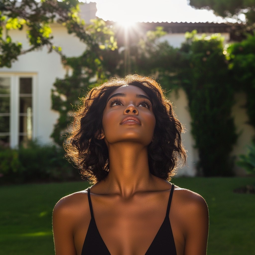 Создано на основе запроса: a dark skinned beautiful woman with dark medium length hair looks up into the bright sky above the camera