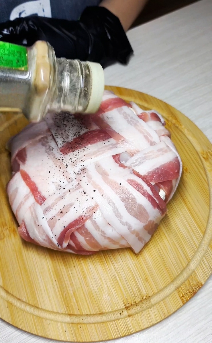 Ингредиенты: — Сыр с плесенью (камамбер) – 1 шт. — Бекон – 1 упаковка (150 гр) — Грудка куриная (2 вырезанных кружочка) – 200 гр. — Хлеб тостовый – 2 шт. — Аджика – 2 ст. ложки — Чеснок – 2, 3 зубчика — Перец черный молотый – по вкусу. — Зелень руккола – 20 гр. Приготовление: 1. Берем куриную грудку, прикрываем пакетом и слегка отбиваем. Если у Вас как и у меня нет молоточка — берём толкушку. Главное — не переусердствовать, нам нужна грудка, а не куриное пюре. 2. Почти, как на уроке труда: Прикладываем коробочку от сыра к куриной грудке и вырезаем кружки. Таких мясных кружочков нам нужно два. 3. Теперь у нас «кружок плетения»: Раскладываем бекон ввиде решетки. Бекон должен лежать ровно, плотно и красиво — как будто снимаем для своих соц. сетей. 4. В центр беконной решетки кладем: Сначала кружочек грудки, сверху сыр камамбер и завершаем вторым кружочком куриной грудки. 5. Продолжим наше «плетение»: Края бекона сводим к центру (плотно), как будто он очень соскучился по этой кур