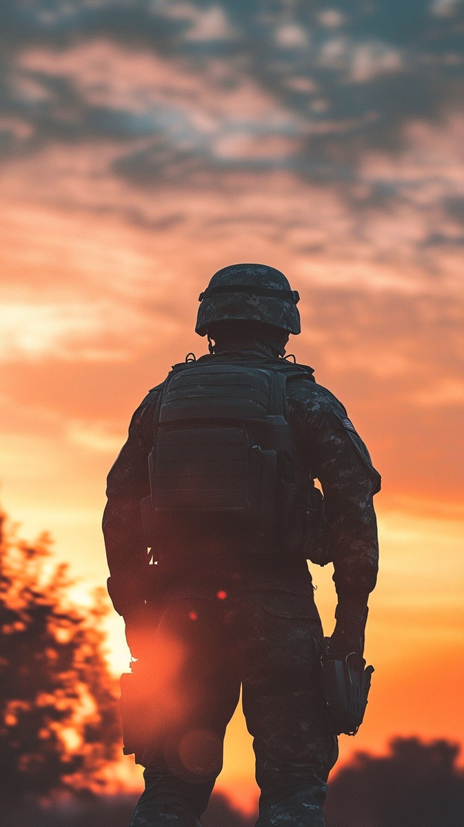 Создано на основе запроса: A silhouette of an American soldier in full gear, standing tall against the backdrop of sunset, with his back to