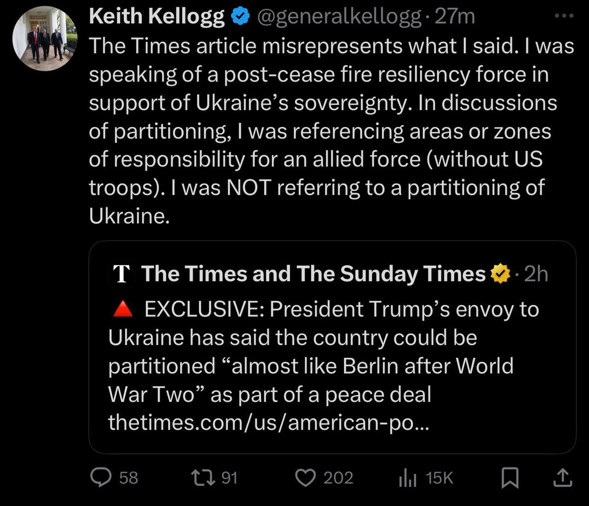 В ответ на пост Kellogg backtracks after floating post-WW2 Berlin-style carve-up of Ukraine Blames media for ‘misrepresenting’ him Here’s what he said: ‘You could almost make it look like what happened with Berlin… when you had a Russian zone, a French zone, and a British zone, a US zone’