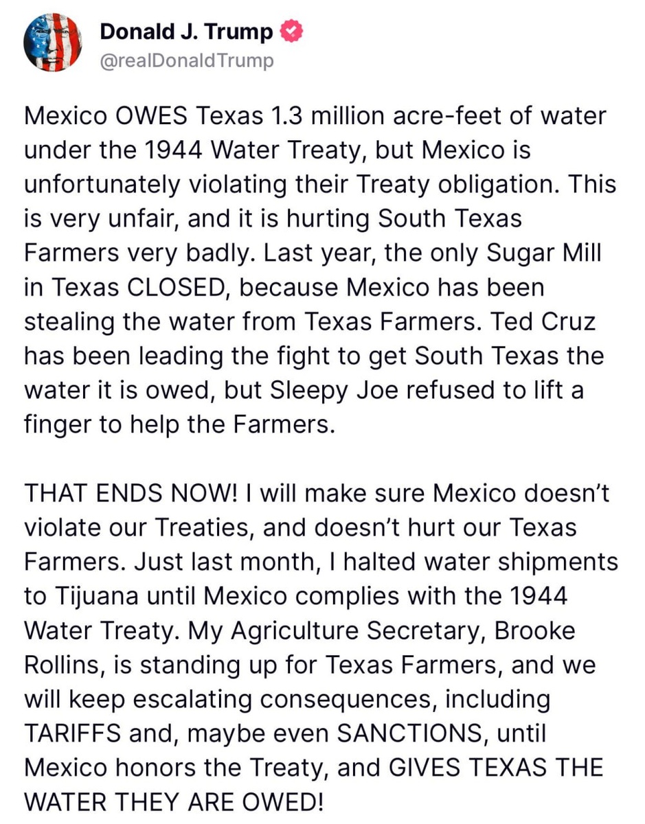 Когда наступает темное время суток и силы зла царствуют безраздельно... Там, далеко за океаном просыпается Дональд Трамп и начинает нести пургу. «Мексика должна Западному Техасу 1,3 миллиона акро-футов воды по Водному договору 1944 года, но Мексика, к сожалению,нарушает свои договорные обязательства. Это несправедливо, и это очень сильно вредит южно-техасским фермерам. В прошлом году единственная сахарнаяфабрика в Техасе ЗАКРЫЛАСЬ, потому что Мексика воровала воду у техасских фермеров. Тед Круз был лидером борьбы за то, чтобы Южный Техас получил причитающуюся ему воду, но Сонный Джо отказался и пальцем пошевелить, чтобы помочь фермерам. ЭТОМУ ПРИХОДИТ КОНЕЦ СЕЙЧАС! Я прослежу за тем, чтобы Мексика не нарушала наши договоры и не вредила нашим техасским фермерам. Только в прошлом месяце я приостановил поставки воды в Тихуану, пока Мексика не выполнит Водный договор 1944 года. Мой министр сельского хозяйства Брук Роллинс отстаивает интересы техасских фермеров, и мы будем продолжать усилив