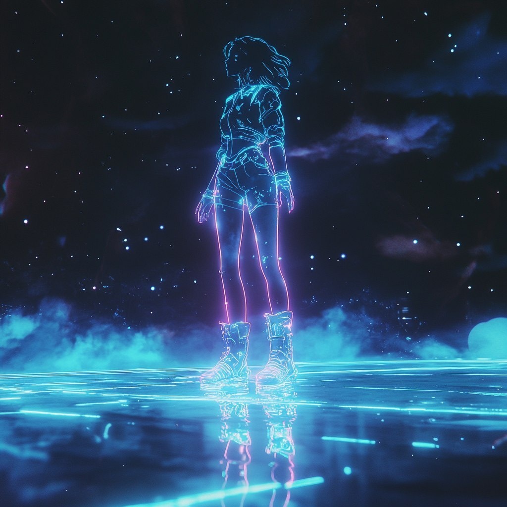 Создано на основе запроса: VHS-style screenshot of a glowing holographic woman in boots standing on an ice rink, in the style of 1990s
