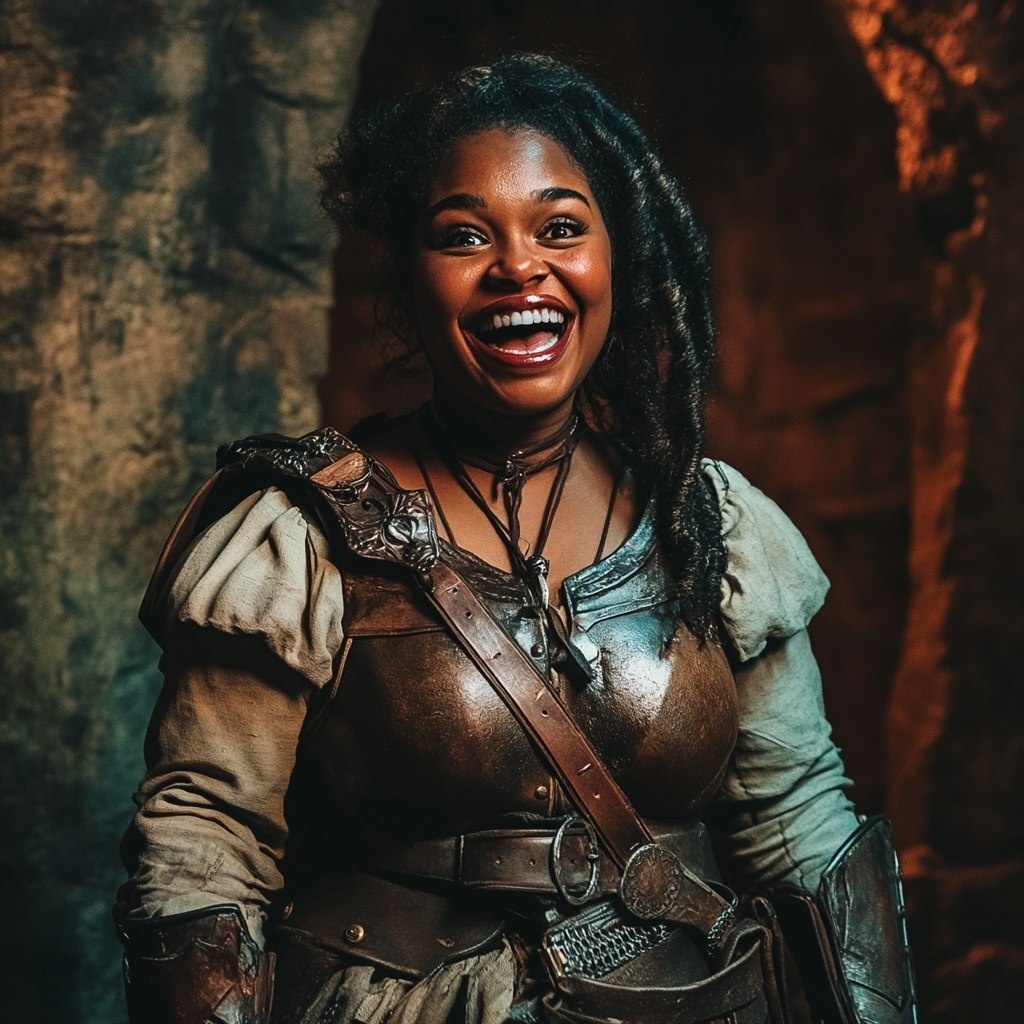 Создано на основе запроса: a photo of an exotic chunky character. She has a comical big smile. She poses dramatically. She is dressed in medieval fantasy gear. The background is an ancient dungeon. Dramatic lighting.