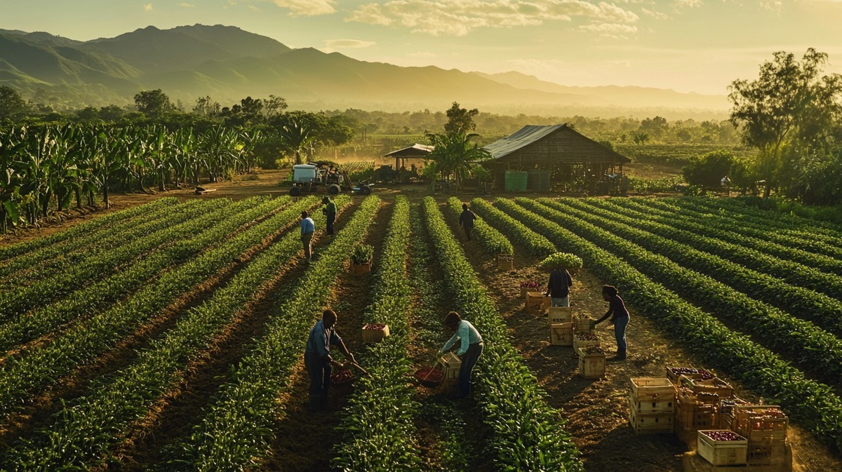 Создано на основе запроса: A sweeping, panoramic view of a vast, fertile farm under warm morning sunlight, where a team of Black farmers