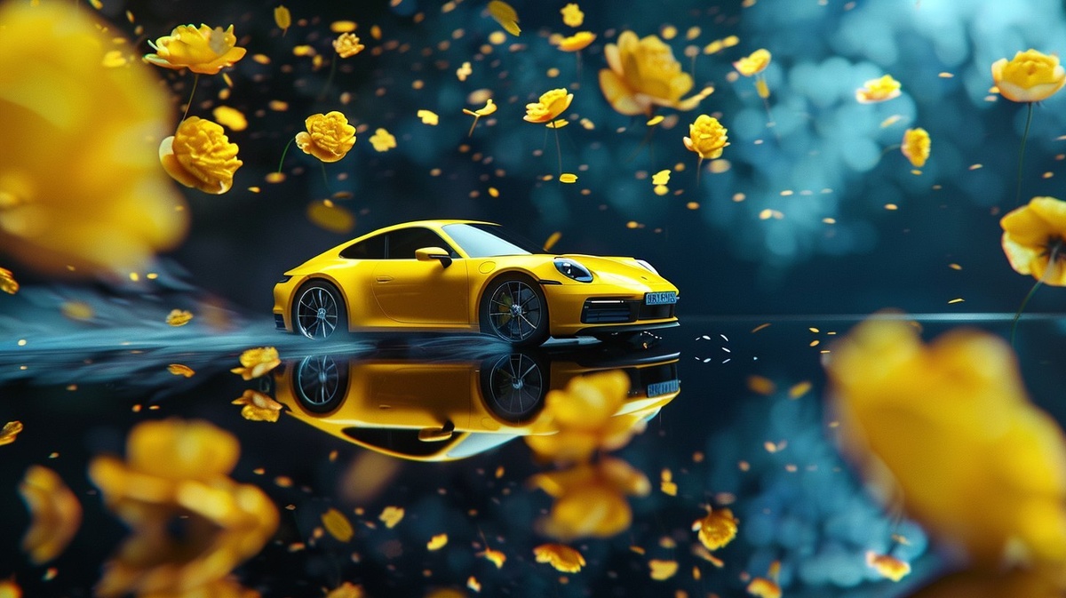 Создано на основе запроса: a neon yellow Porsche 911 in motion, noticeable speed, flowers trailing in the wind, some petals flying off, cinematic motion blur, surreal minimal background