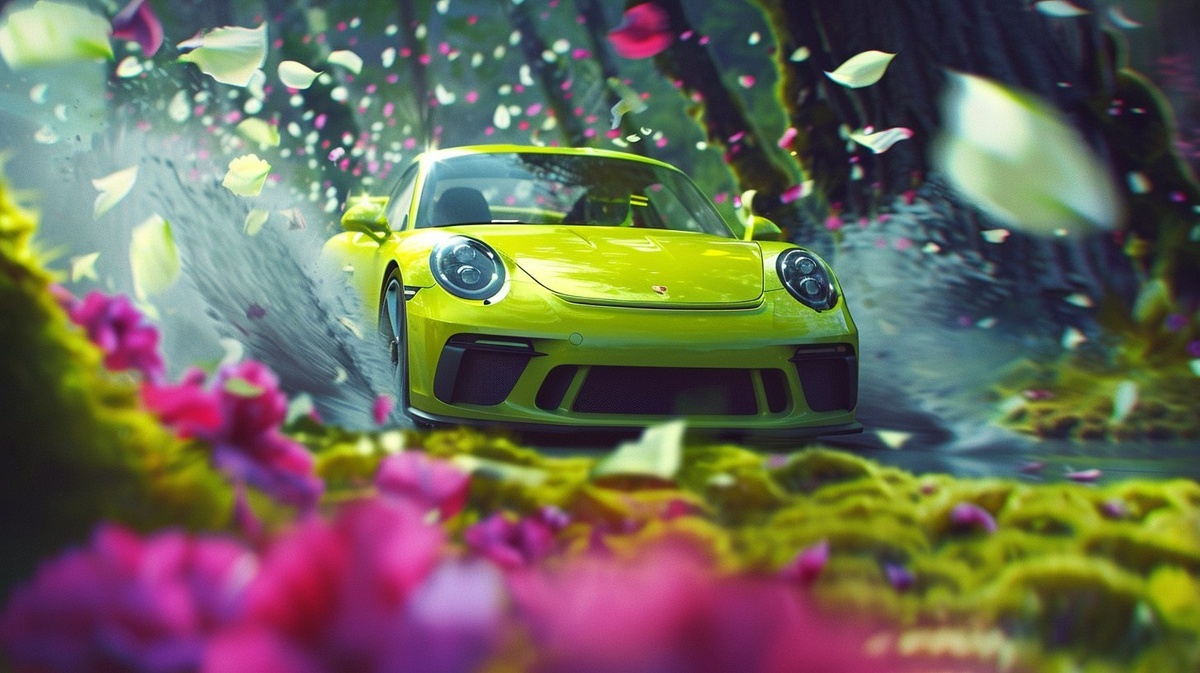 Создано на основе запроса: a neon yellow Porsche 911 gaining speed, wind pushing flowers back, moss and petals moving with airflow, motion blur increases, dramatic front angle