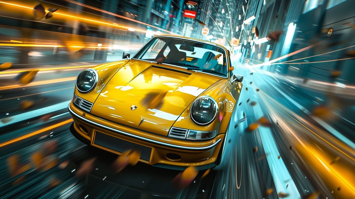 Создано на основе запроса: a neon yellow Porsche 911 racing, only a few flowers left on mirrors and roof, long motion streaks, petals in the