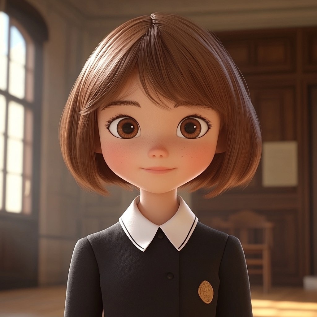 Создано на основе запроса: cute animated image, of mathilda, from the rohld dahl moive, in school uniform, light brown hair
