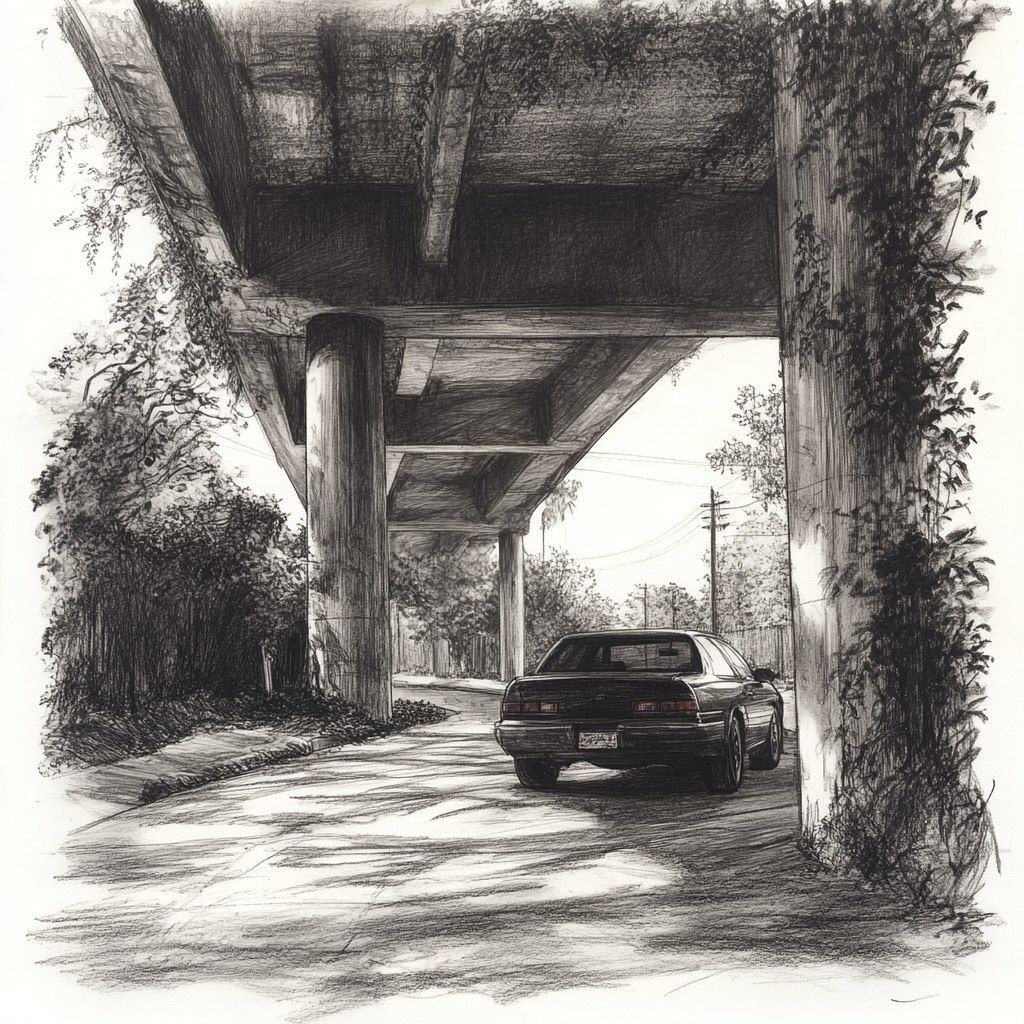 Создано на основе запроса: A rough, hand-drawn pencil sketch in black and white, capturing a quiet, romantic moment in a Los Angeles neighborhood beneath the I-5 freeway overpass. The overpass arcs gracefully overhead, its concrete pillars softened by ivy and long, dappled shadows. A parked car sits quietly on a gently curving street, surrounded by hints of an older but nice LA neighborhood. The scene feels peaceful, warm, and hidden --- Автоперевод: Грубый, нарисованный вручную карандаш в черно-белом цвете, запечатлевая тихий, романтический момент в районе Лос-Анджелеса под автострадой I-5. Круто выглядит? 🤔 https://dzen.ru/id/65c0c65c86e4f837c27b24d7 #ИИ #AI #нейросеть #midjourney #art