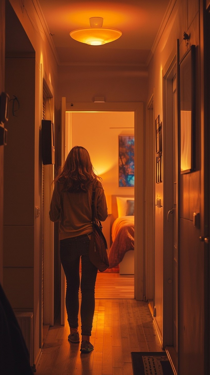 Создано на основе запроса: apartment hallway with warm overhead lighting, woman walking into roommate’s bedroom, looking curious but unaware, over-the-shoulder shot