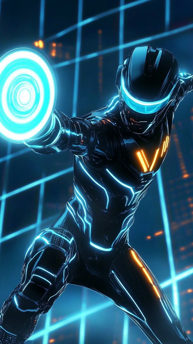 Создано на основе запроса: A TRON: Legacy warrior in a dynamic action pose, throwing a glowing identity disc mid-air, wearing a sleek black suit with vibrant blue neon circuit lines, nibiru translucent visor helmet, intense energy trail from the disc, dramatic lighting on the digital grid background, cinematic futuristic scene