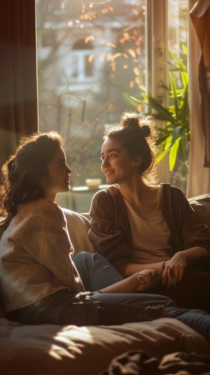 Создано на основе запроса: cinematic apartment interior, two young women sitting on a couch in casual home clothes, relaxed atmosphere, warm