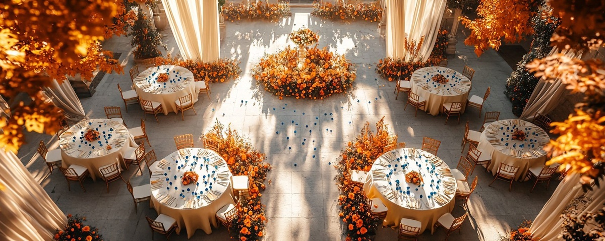 Создано на основе запроса: realistic image from the top view of with a 300mm camera a wedding venue with catwallk at the middle and on the sides there is a coaches then there is a rounded beige tables and white shairs and curtains with concret and blue drops and orange flowers in sunny enviroment