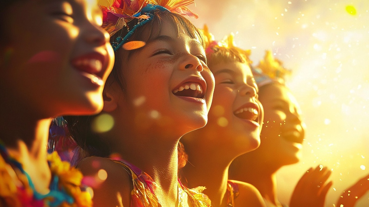 Создано на основе запроса: A vibrant, closeup of 4 children’s faces a sunlit scene of photorealistic children smiling and playing together