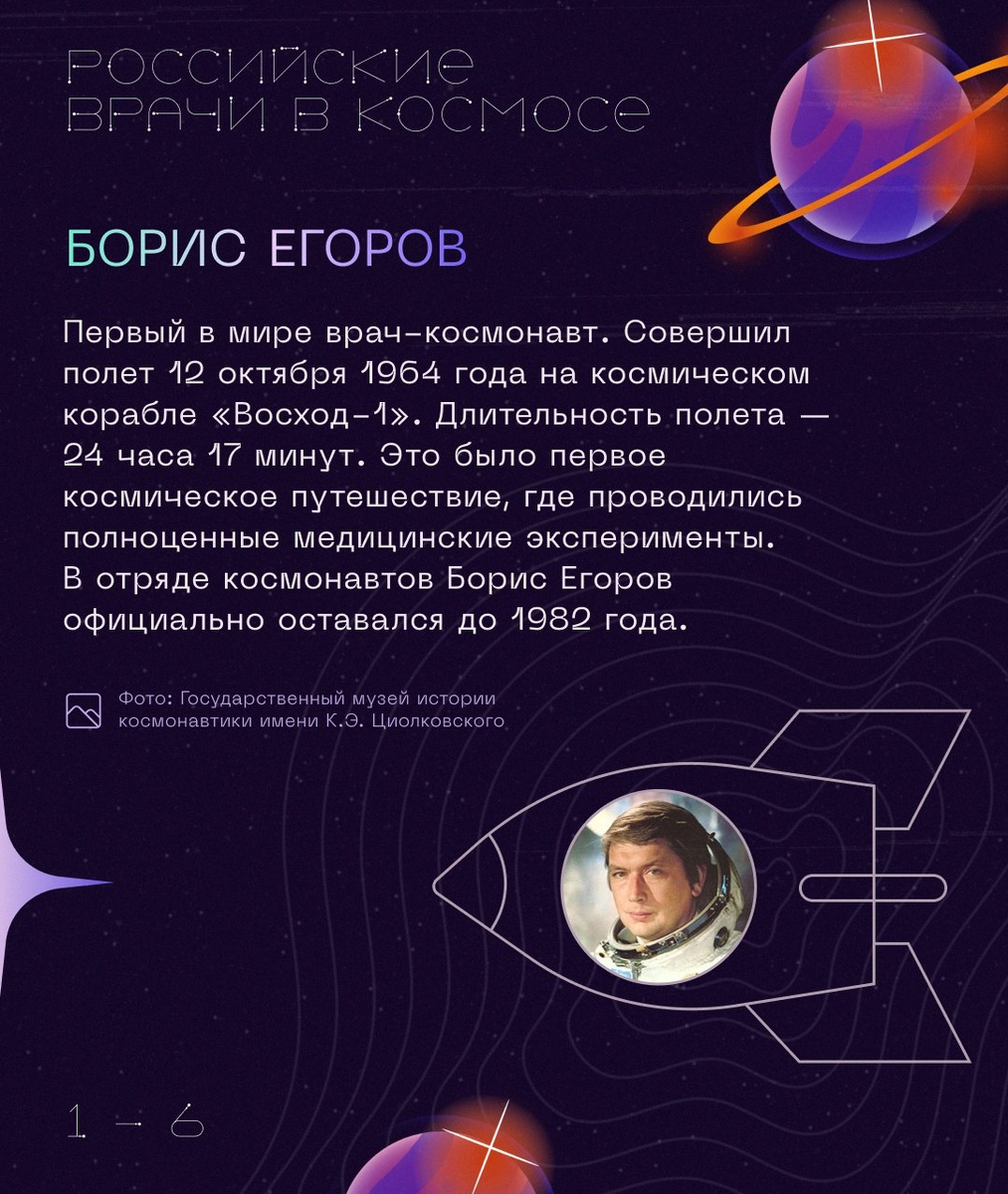 🚀С Днём космонавтики, друзья! 👽 В этот день мы поздравляем всех, кто связан с освоением космоса. Этот праздник — напоминание о том, как важно мечтать и стремиться к неизведанному. Мы особенно хотим отметить роль врачей-медиков в космических миссиях. Одни из них обеспечивают здоровье и безопасность космонавтов, помогают им сохранять работоспособность в условиях невесомости и других космических факторов, другие же прославились своими выдающимися исследованиями в области медицины в космическом пространстве. 🚀Собрали для вас небольшую подборку медицинских героев в космосе. Подробности в карточках. 📱Подписаться, чтобы узнать больше #здоровье_96