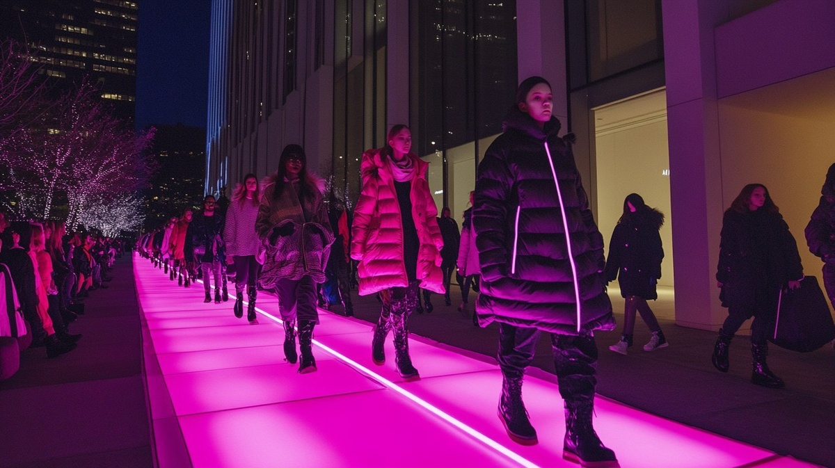 Создано на основе запроса: fashion show, side angle view of procession of female and male models walking on sidewalk in front of MOMA museum, wearing uniqlo fashion, fashion forward heat tech clothes, and puffer jackets walking in a row on a pink path line on the sidewalk in front of MOMA museum at night, projection mapped pink path line the models are walking on, wide angle of museum sidewalk --- Автоперевод: Шоу мод, побочный вид на шествие женских и мужских моделей, идущих по тротуару перед музеем Мома, в моде Uniqlo, одежде для тепловой технологии моды и пухло Как тебе такая иллюстрация? 🤔 https://dzen.ru/id/65c0c65c86e4f837c27b24d7 #ИИ #AI #нейросеть #midjourney #art