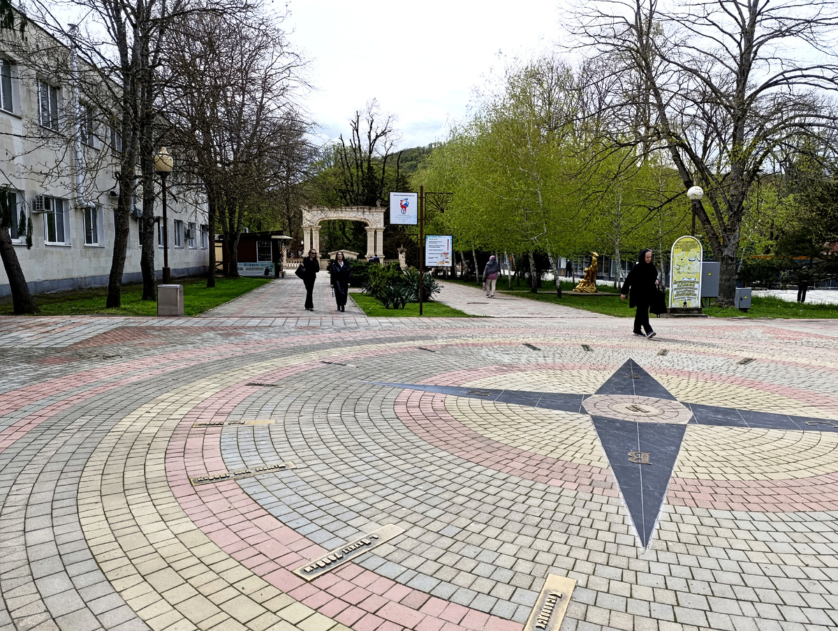 Сегодня погода с утра не задалась, по прогнозу до 13 ч дождь. Ну что же, значит, у меня есть время рассказать вам про другие достопримечательности Горячего ключа, а именно про Горный парк. Именно сюда устремляются все туристы, приезжающие на денёк из ближайших городов. И именно сюда в первую очередь направилась и я, пока день был солнечный и не было толп народа. После знакомства с Круглым озером я в очередной раз пошла в этом направлении. И хотя по центральной аллее я проходила неоднократно, этот компас я увидела впервые , т.к. в этом месте я сворачивала на дорожку вправо. А тут решила снять общий план и увидела под ногами вот такую Розу Ветров с нулевым километром с расстоянием до некоторых городов. А вот и арка,с которой начинается Горный парк. Ну и по указателю: прямо пойдешь в Дантово ущелье придёшь, вправо пойдешь - к реке Псекупс придёшь. К реке мы сходим попозже, а сейчас к ущелью. С 2023 года на подходе к ущелью идет масштабная реконструкция популярных терренкуров. Благоус