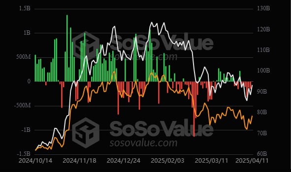 🔸11 апреля спотовые биткоин-ETF показали общий чистый отток в размере $1,03 млн, что стало седьмым днем подряд чистого оттока
