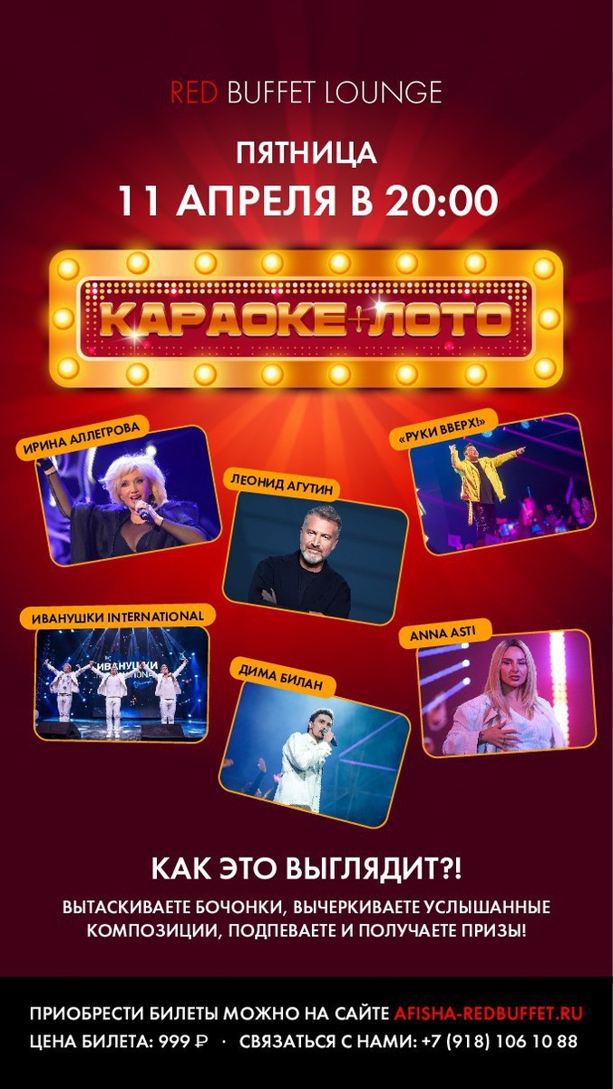 RED BUFFET LOUNGE 11 АПРЕЛЯ В 20:00 КАРАОКЕ+ЛОТО Самое массовое караоке! Вытаскивай бочонки, подпевай и получай призы. 🎫КУПИТЬ БИЛЕТ (999р) 12 АПРЕЛЯ В 20:00 КОСМИЧЕСКИ КРУТОЙ STAND UP Карен Гевандян, Лера Ясеновская и Асельдар Махмудов — участники проектов Comedy Баттл на ТНТ, Open Mic VK и Money Mic VK. 🎫КУПИТЬ БИЛЕТ (от 599р) 18+ 📍 Red Buffet Lounge, ул. Юных Ленинцев, 10/2 📞 +79181061088