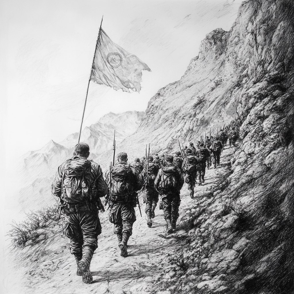 Создано на основе запроса: realist black and white pencil sketch of battle worn communist guerrilla soldiers on the long march. Wide shot if them heading thru a mountain pass with banners held high