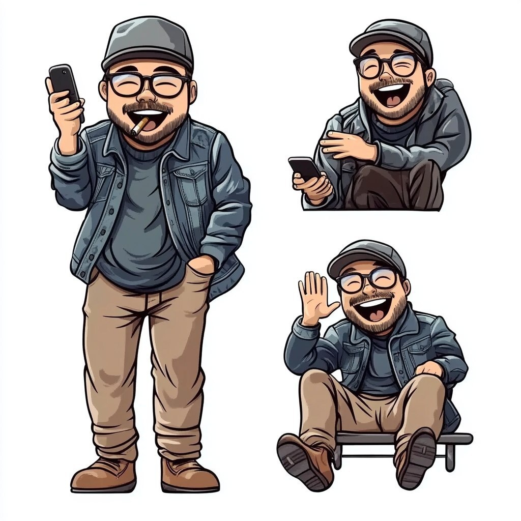Создано на основе запроса: a cheerful Japanese man with light stubble and glasses, with a soft and solid build, wearing a gray newsboy cap, denim jacket, khaki work pants, and brown leather boots, shown in 4 different scenes: smoking a cigarette calmly, checking his smartphone, waving with a big smile, yawning and stretching while sitting on a bench soft semi-realistic cartoon style, clean lines, white background, no text, for LINE sticker --- Автоперевод: Веселый японский мужчина с легкой щетиной и очками, с мягкой и твердой сборкой, в серой кепке для газетчика, джинсовой курткой, рабочими штанами хаки и коричневыми кожаными ботинками, показанными в 4 разных сценах: курить сигарет, спокойно, проверяя свой смартфон, махая с большим улыбкой, не натянувшись, не наступая на скамей Хорошо вышло? 🤔 https://dzen.ru/id/65c0c65c86e4f837c27b24d7 #ИИ #AI #нейросеть #midjourney #art
