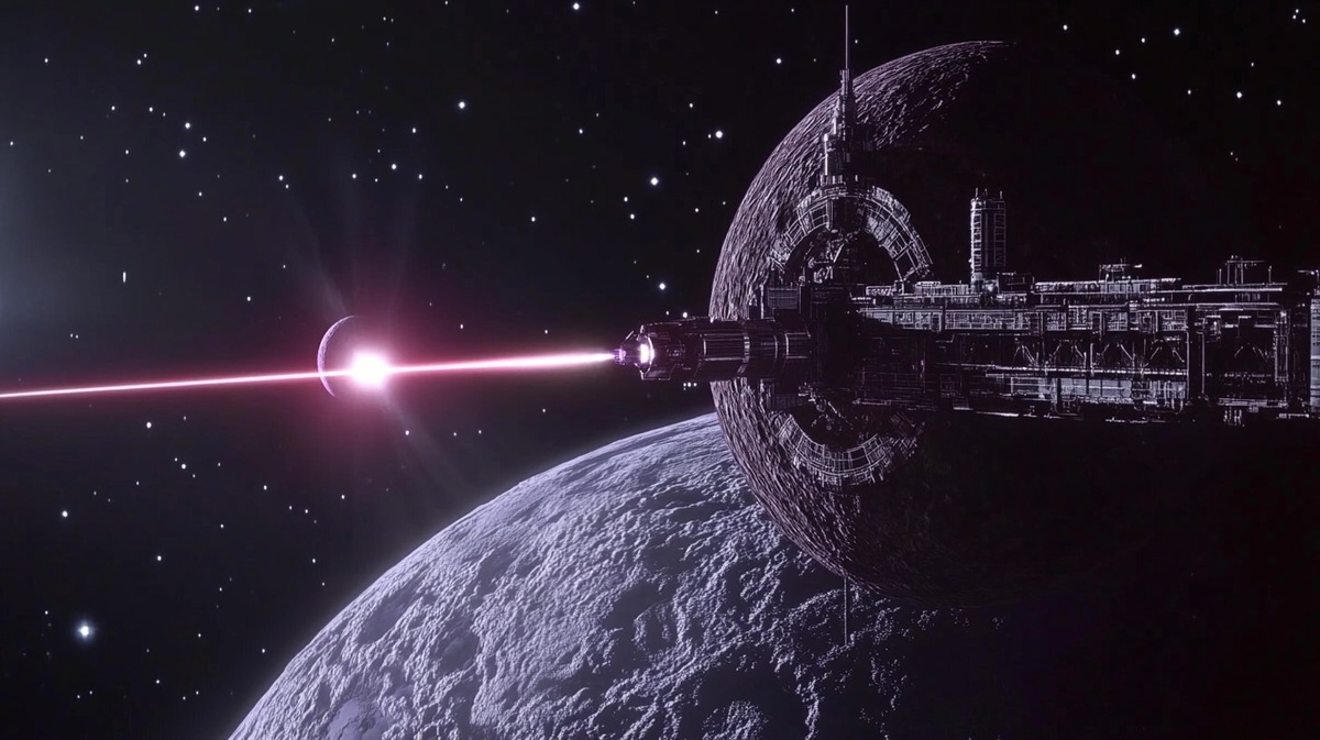 Создано на основе запроса: a cinematic still of a moon sized space station firing a laser from it's equator at the planet nibiru