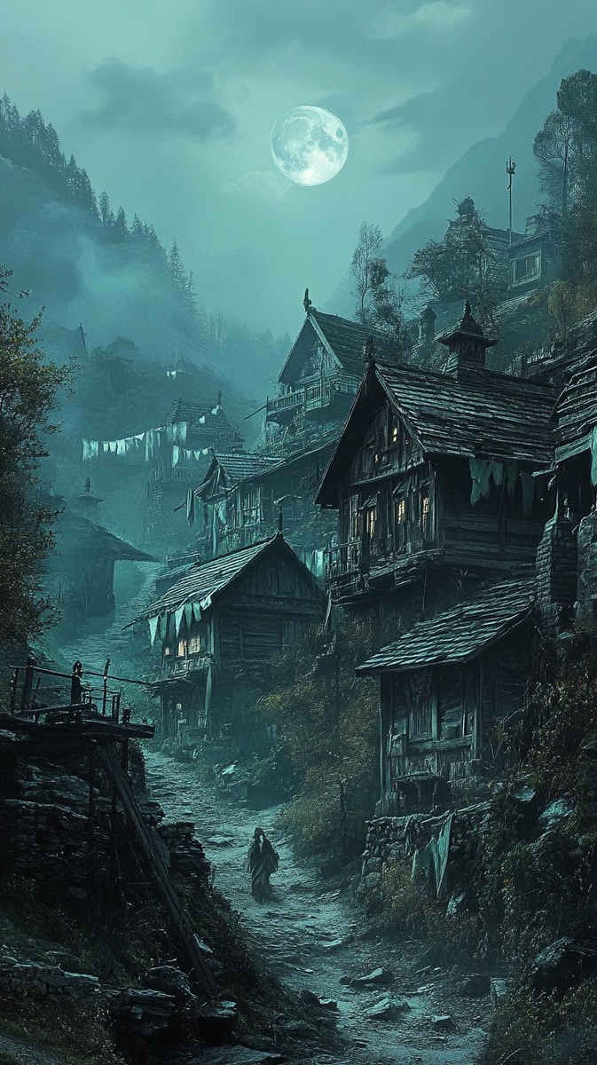 Создано на основе запроса: haunted village, leaning timber houses, torn prayer flags, pale moonlight, faint ghostly figures