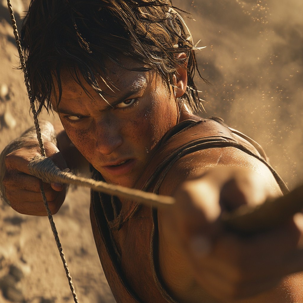 Создано на основе запроса: Close-up of David swinging his sling, eyes locked on Goliath, intense focus, the stone flying at high speed, dust