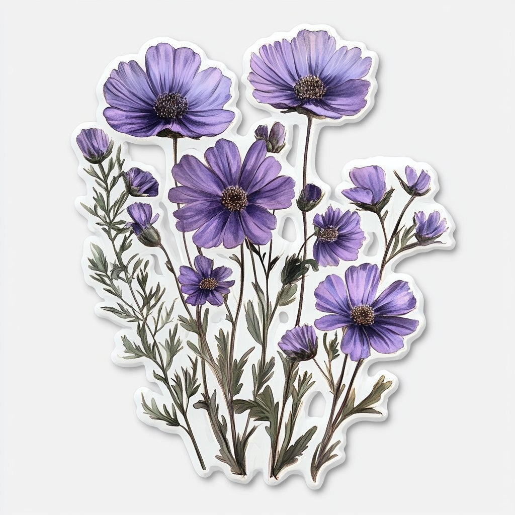 Создано на основе запроса: a sticker display of realistic purple flowers grouped together with a white background