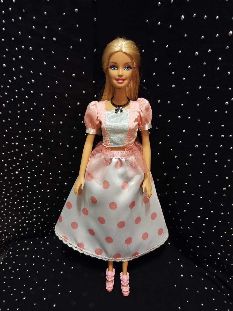 Всем доброго дня! Ну вот и я собралась поучаствовать в челендже одеть кукол в какой-то специфический принт. Очень многие соххобиты показали своих кукол в одежде в горошек- и мне все очень понравились! Поэтому тоже захотелось в этом челендже взять участие- а ни одного платья в горошек как назло не было. И вот сегодня совершенно случайно удалось приобрести такую одежку Покажу две куколки, одна классическая супер-старка, с огромной копной светлых, практически белых волос. Одета в красный сарафан в белый горошек, и еще одна особенность - на голове у нее кепка, только нев горошек, а маленькие красные сердечки. Прикольно. Она так и продавалась А вторая Барби очень красивая, тоже я ее купила без одежды, и думала вначале что это типичная милли, но сейчас не уверена. Я нашла в инете первоначальный образ, в конце фотосессии покажу, может быть кто-то узнает Эту Барби я как раз нарядила в этот комплект, что купила сегодня- белая атласная юбочка в розовый горох, и нежно-розовая атласная кофточк