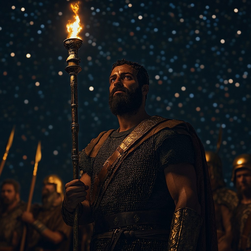 Создано на основе запроса: Gedeon, a strong Israelite leader with a determined face, standing before his 300 warriors, wearing a simple tunic and leather armor, gripping a torch and a trumpet, the night sky full of stars, hyper-realistic, photo realism, cinematography --- Автоперевод: Гедеон, сильный израильский лидер с решительным лицом, стоящим перед его 300 воинами, одетый в простую тунику и кожаную броню, зажигая факел и трубу, ночное небо, полное звезд, гиперреалистичный, фотореализм, кинематография Как тебе эта генерация? 🤔 https://dzen.ru/id/65c0c65c86e4f837c27b24d7 #ИИ #AI #нейросеть #midjourney #art
