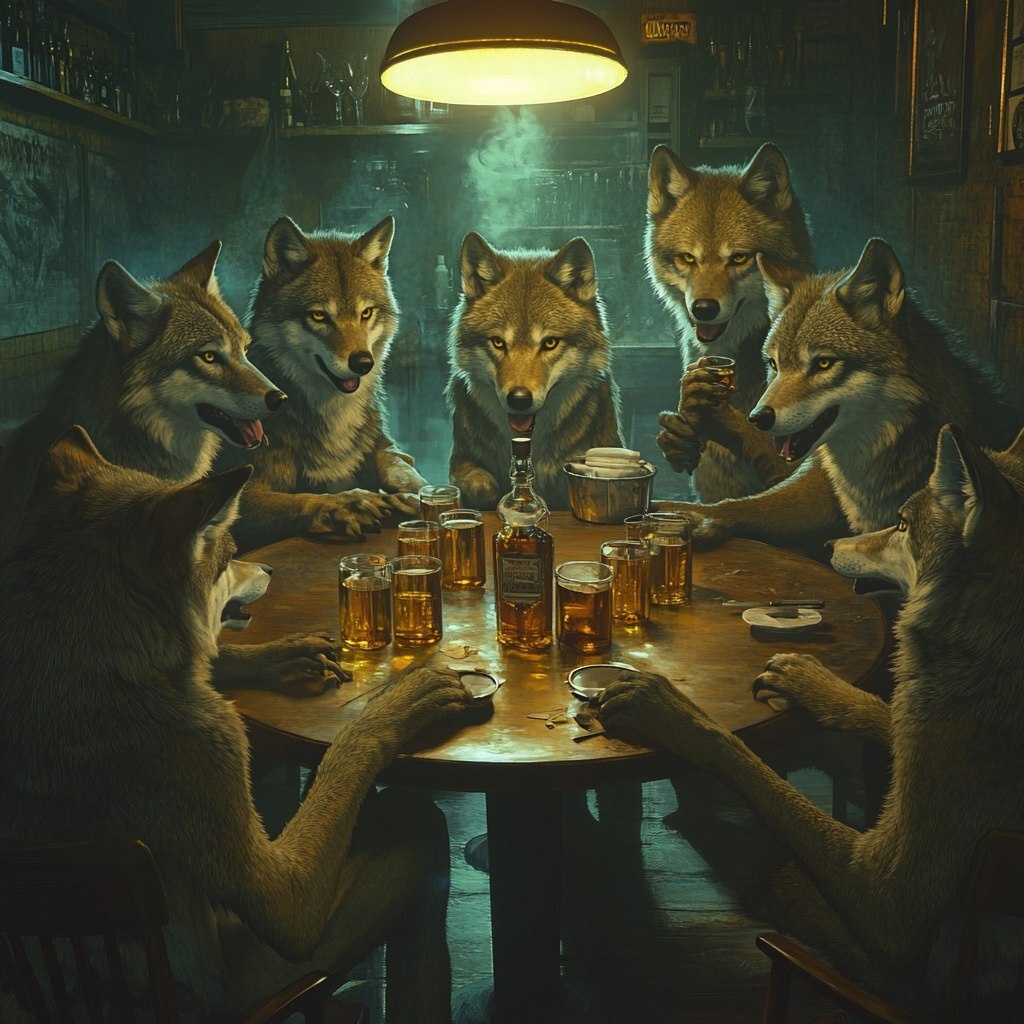 Создано на основе запроса: Make wolves enjoying themselves and having fun in a nightclub, with glasses of whiskey in their hands, surrounding a round table that has a bottle of whiskey, there have mineral waters on the table, an ice bucket on the table, the whole nightclub is full of wolves. --- Автоперевод: Заставьте волков наслаждаться и веселиться в ночном клубе, с бокалами виски в руках, окружающих круглый столик с бутылкой виски, на столе есть минеральные воды, ледяное ведро на столе, весь ночной клуб полон волков. Как тебе иллюстрация? 🤔 https://dzen.ru/id/65c0c65c86e4f837c27b24d7 #ИИ #AI #нейросеть #midjourney #art