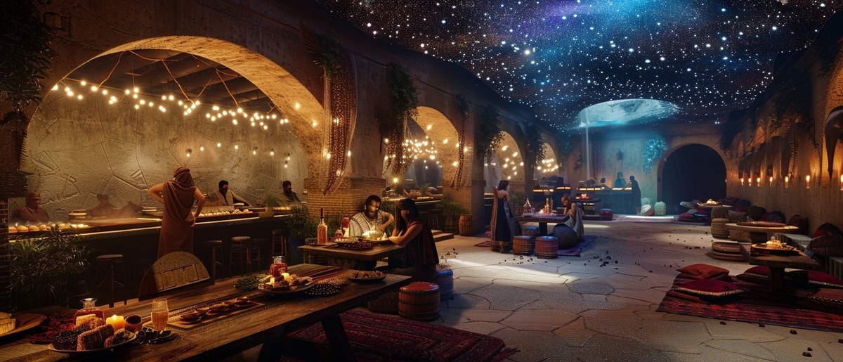 Создано на основе запроса: A dynamic scene inside a Lebanese VR food museum, each guest experiencing a different historical era, one