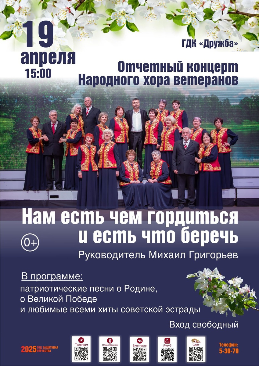 "Нам есть чем гордиться и есть что беречь" - отчетный концерт Народного хора ветеранов 🕒 19 апреля, 15.00 🎼 Талантливый коллектив исполнит композиции разных лет, которые стали частью истории нашей страны. Каждый номер пронизан глубоким смыслом и неподдельной любовью к музыке. Зрители смогут насладиться великолепным исполнением произведений советских и российских композиторов. В год 80-летия Победы в Великой Отечественной войне прозвучат песни военных лет, а также патриотические песни, посвященные Отчизне, родному краю. Присоединяйтесь к нам в этот вечер, чтобы подарить свои аплодисменты и благодарность ветеранам за их преданность творчеству. Вход свободный. Тел. для справок: 5-30-70.