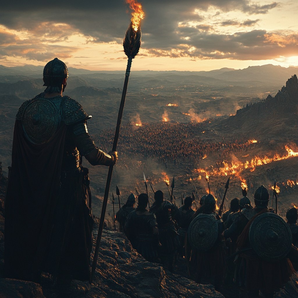Создано на основе запроса: Gedeon and his warriors standing victorious on a hill, torches raised high, watching the defeated Midianite army